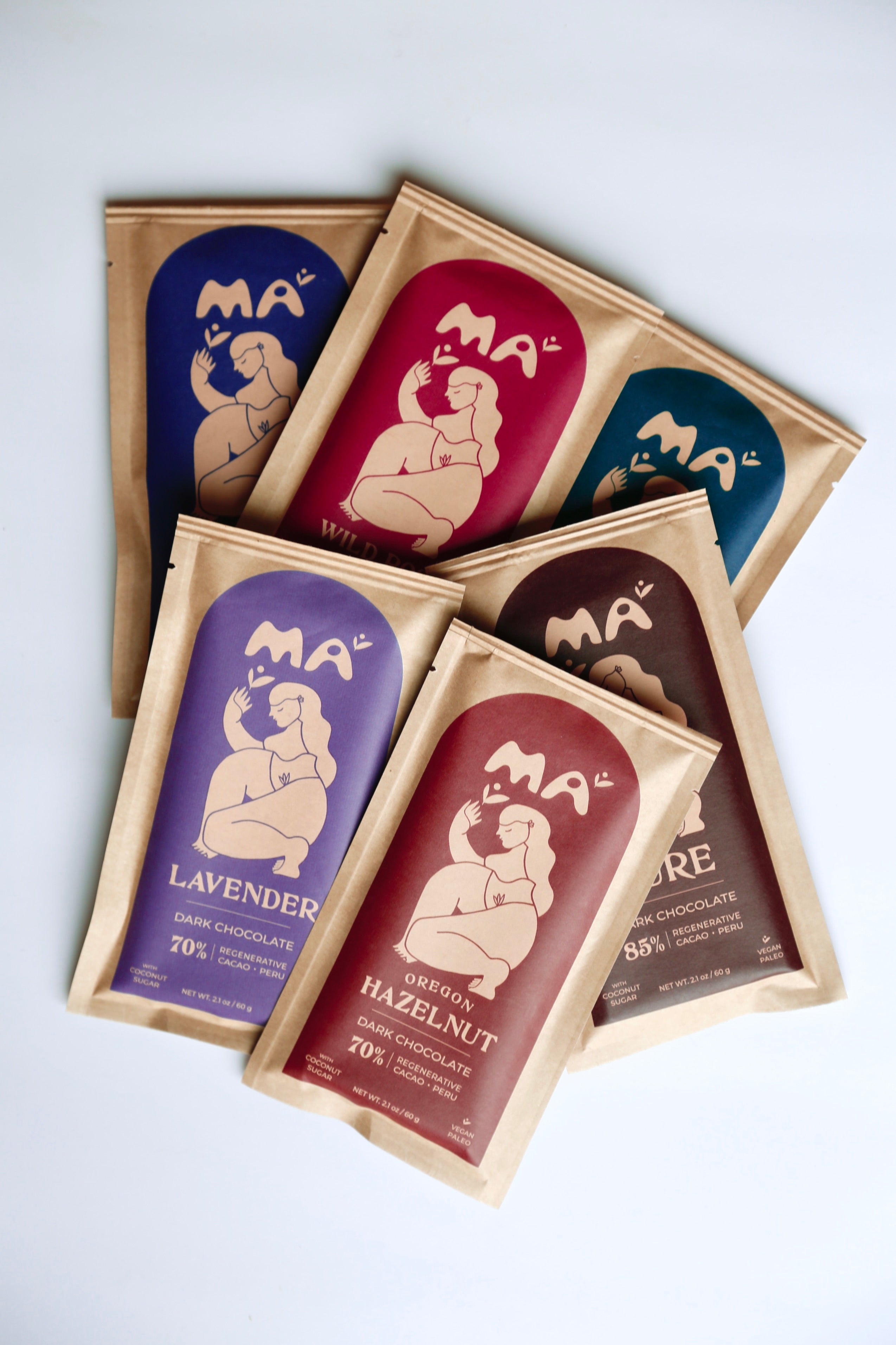 Choose your own custom variety of Ma Cacao bars. Our handcrafted chocolate bars come in various beloved flavors of 70% or 85% dark chocolate. Made from single origin regenerative cacao and unrefined coconut sugar. Handcrafted in Portland, OR.